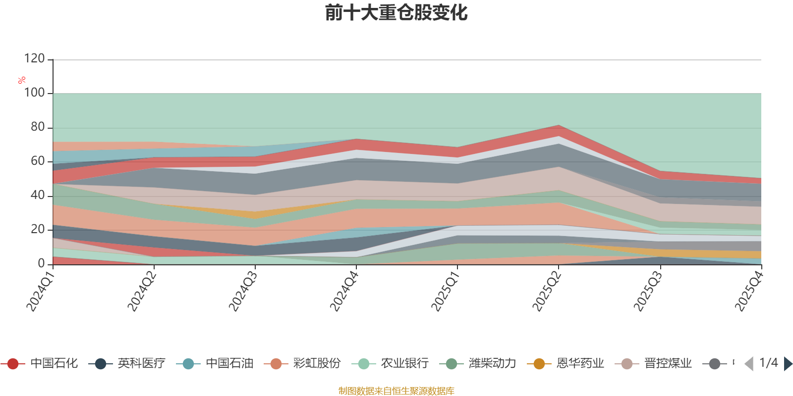 该基金持股集中度较高。截至2025年四季度末,基金十大重仓股分别是渝农商行、齐鲁银行、中国巨石、恩华药业、中国石油、中曼石油、招商轮船、甬金股份、喜临门、TCL科技。