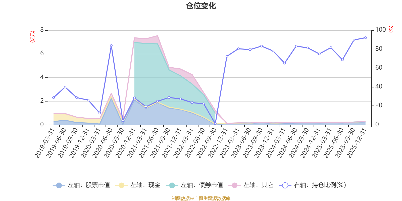 据定期报告数据统计,近三年平均股票仓位为79.77%,同类平均为72.57%。2025年末基金达到92.03%的最高仓位,2022年三季度末最低,为1.16%。