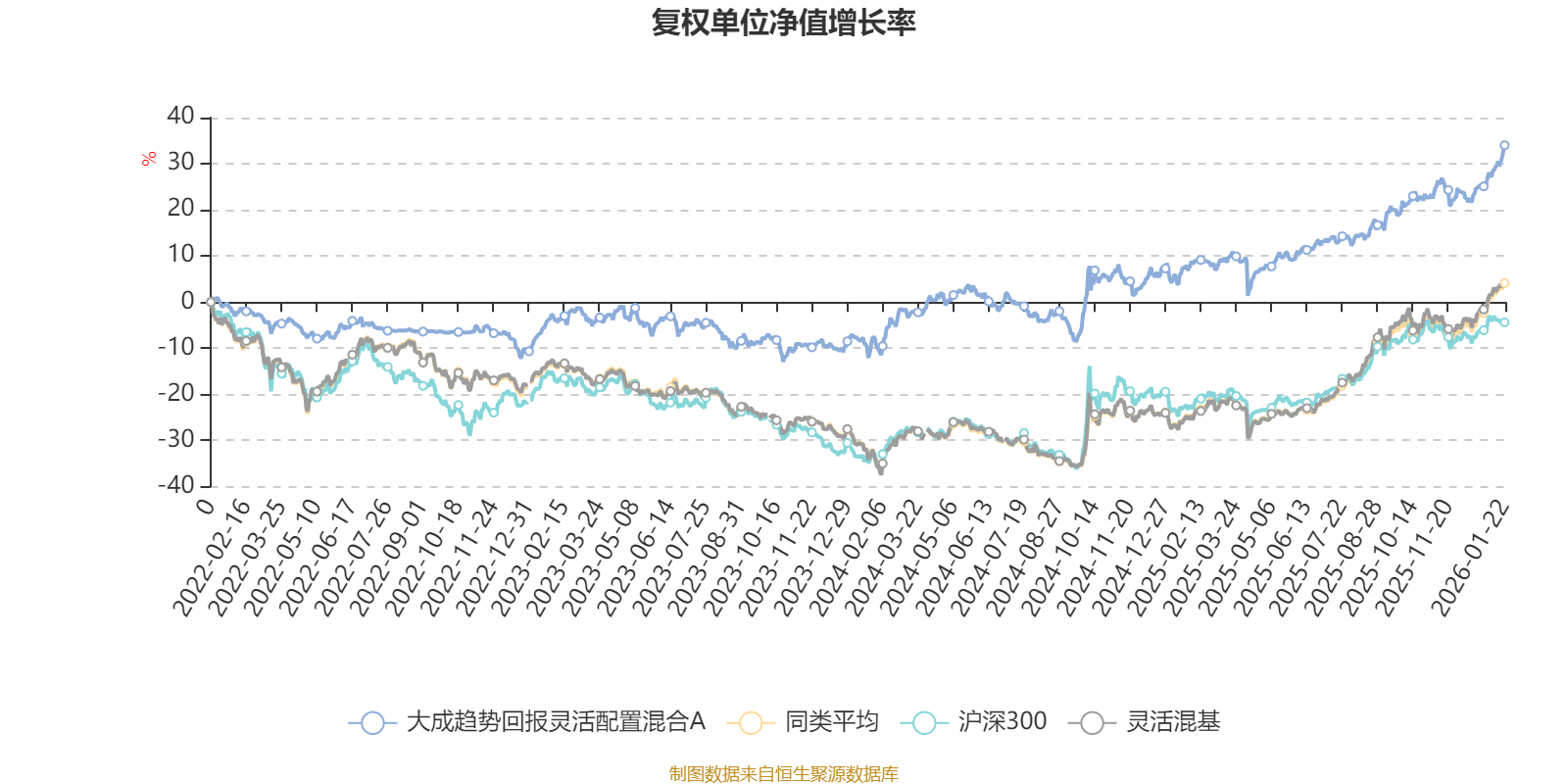截至1月22日,大成趋势回报灵活配置混合A近三个月复权单位净值增长率为9.33%,位于同类可比基金608/1286;近半年复权单位净值增长率为17.26%,位于同类可比基金751/1286;近一年复权单位净值增长率为25.39%,位于同类可比基金811/1286;近三年复权单位净值增长率为39.64%,位于同类可比基金269/1286。