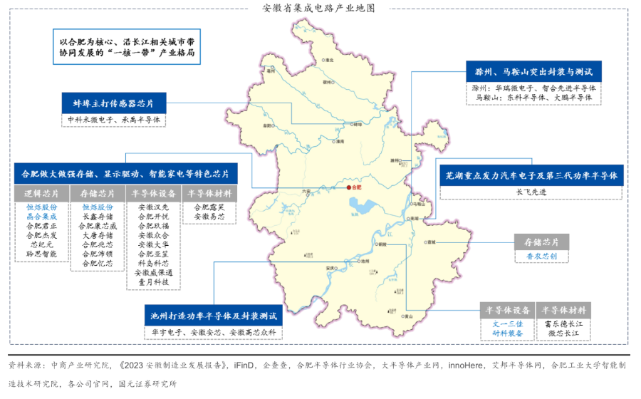 国元证券研究指出,安徽集成电路产业链初步构建起以合肥为核心、沿长江相关城市带协同发展的“一核一带”产业格局,建设合肥集成电路国家级战略性新兴产业集群、海峡两岸集成电路产业合作试验区、中国(蚌埠)传感谷等。其中,合肥做大做强存储、显示驱动、智能家电等特色芯片,蚌埠主打传感器芯片,滁州、马鞍山突出封装与测试行业,池州打造功率半导体及封装测试,芜湖则重点发力汽车电子及第三代功率半导体。