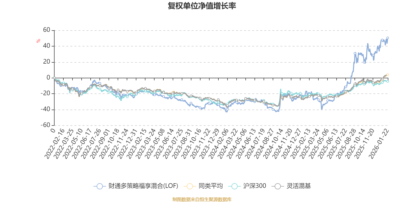截至1月22日,财通多策略福享混合(LOF)近三个月复权单位净值增长率为19.66%,位于同类可比基金140/1286;近半年复权单位净值增长率为69.73%,位于同类可比基金44/1286;近一年复权单位净值增长率为80.00%,位于同类可比基金65/1286;近三年复权单位净值增长率为80.40%,位于同类可比基金59/1286。