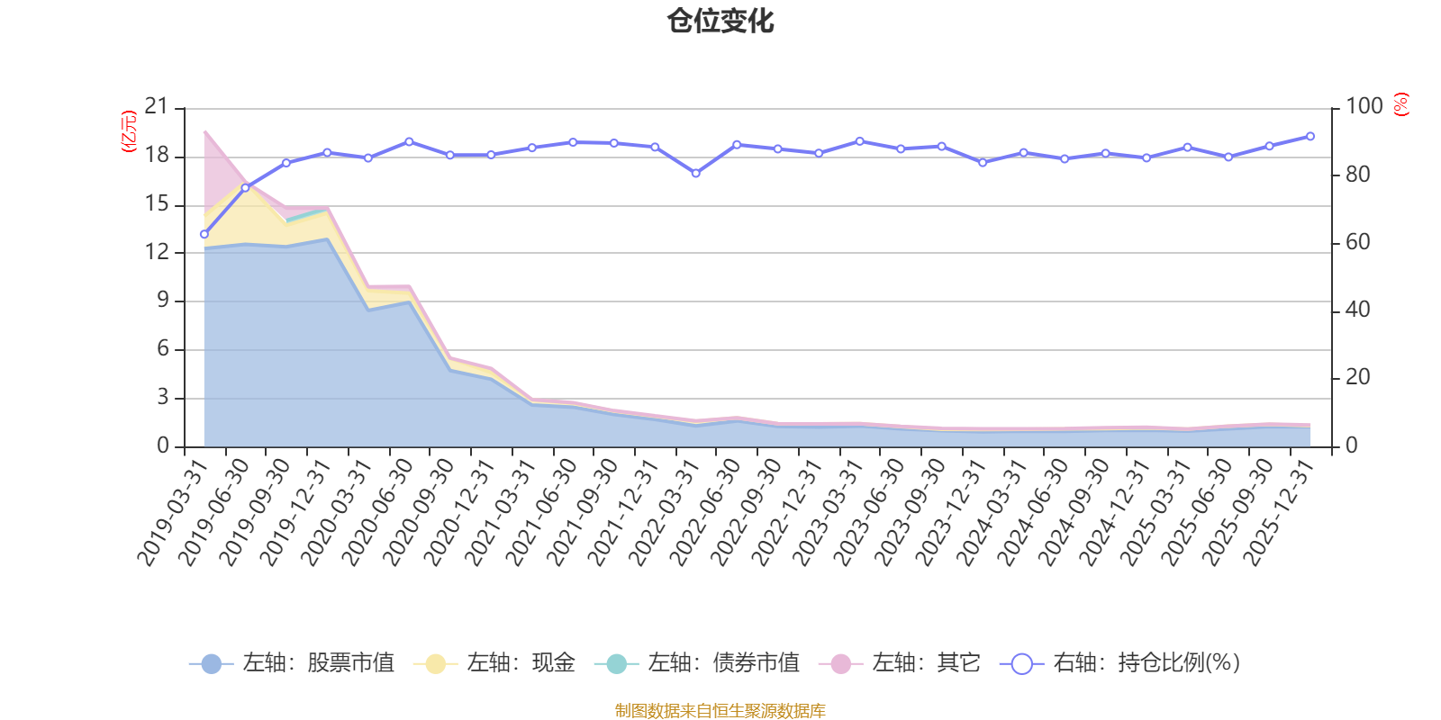 据定期报告数据统计,近三年平均股票仓位为87.4%,同类平均为72.57%。2025年末基金达到91.66%的最高仓位,2019年一季度末最低,为62.76%。