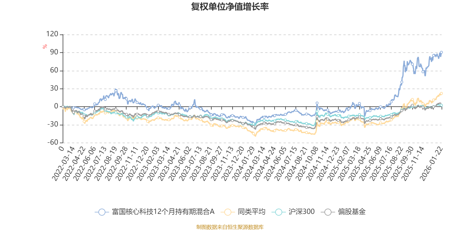 截至1月22日,富国核心科技12个月持有期混合A近三个月复权单位净值增长率为13.72%,位于同类可比基金123/229;近半年复权单位净值增长率为71.27%,位于同类可比基金43/229;近一年复权单位净值增长率为94.48%,位于同类可比基金29/222;近三年复权单位净值增长率为91.32%,位于同类可比基金36/165。