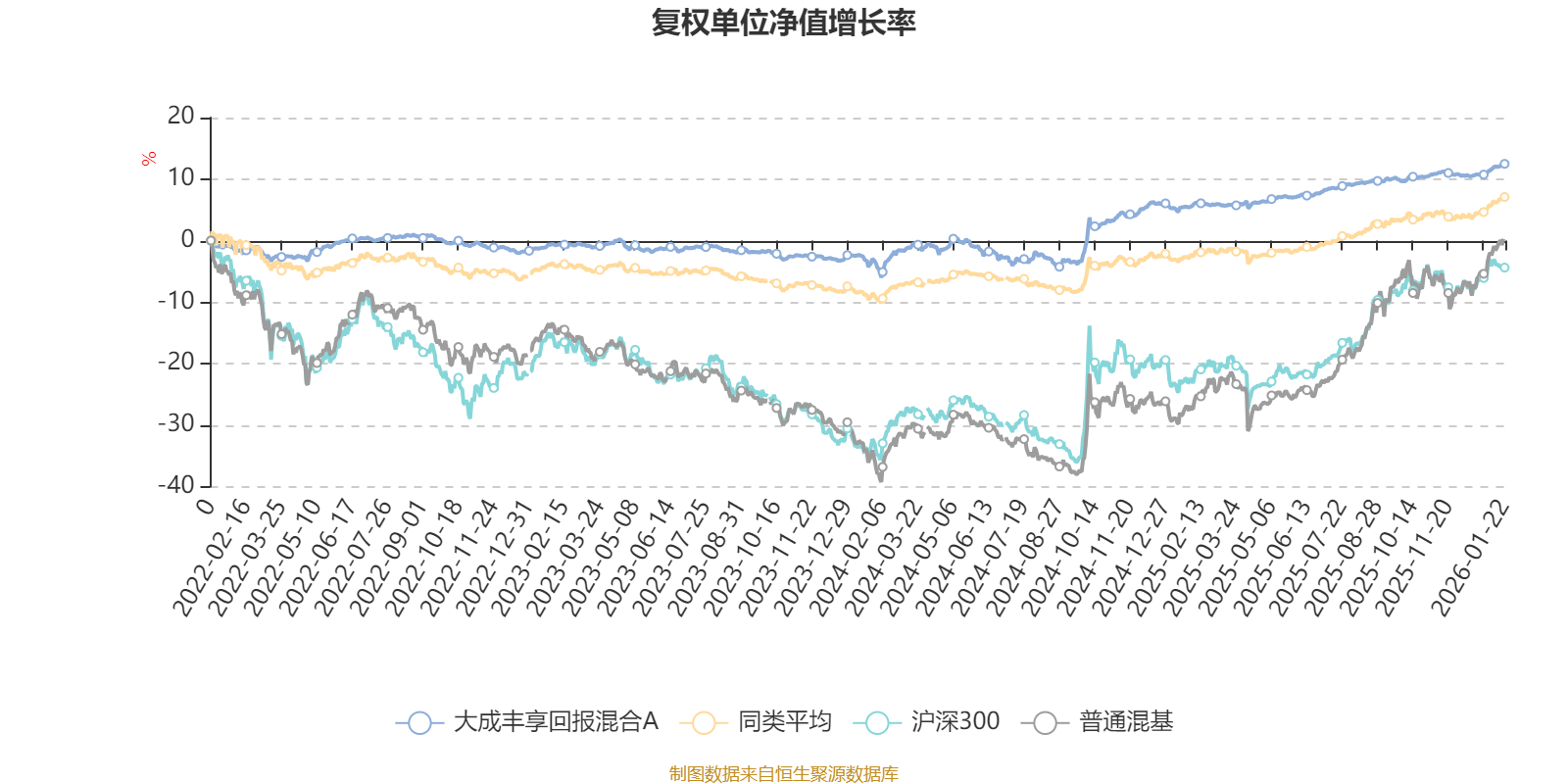 截至1月22日,大成丰享回报混合A近三个月复权单位净值增长率为1.91%,位于同类可比基金349/629;近半年复权单位净值增长率为3.32%,位于同类可比基金401/629;近一年复权单位净值增长率为6.69%,位于同类可比基金372/626;近三年复权单位净值增长率为13.43%,位于同类可比基金226/564。