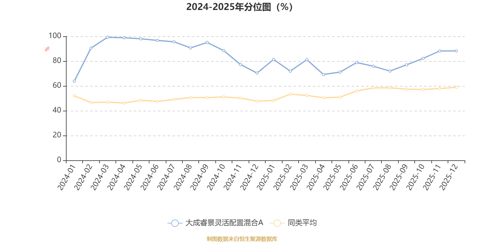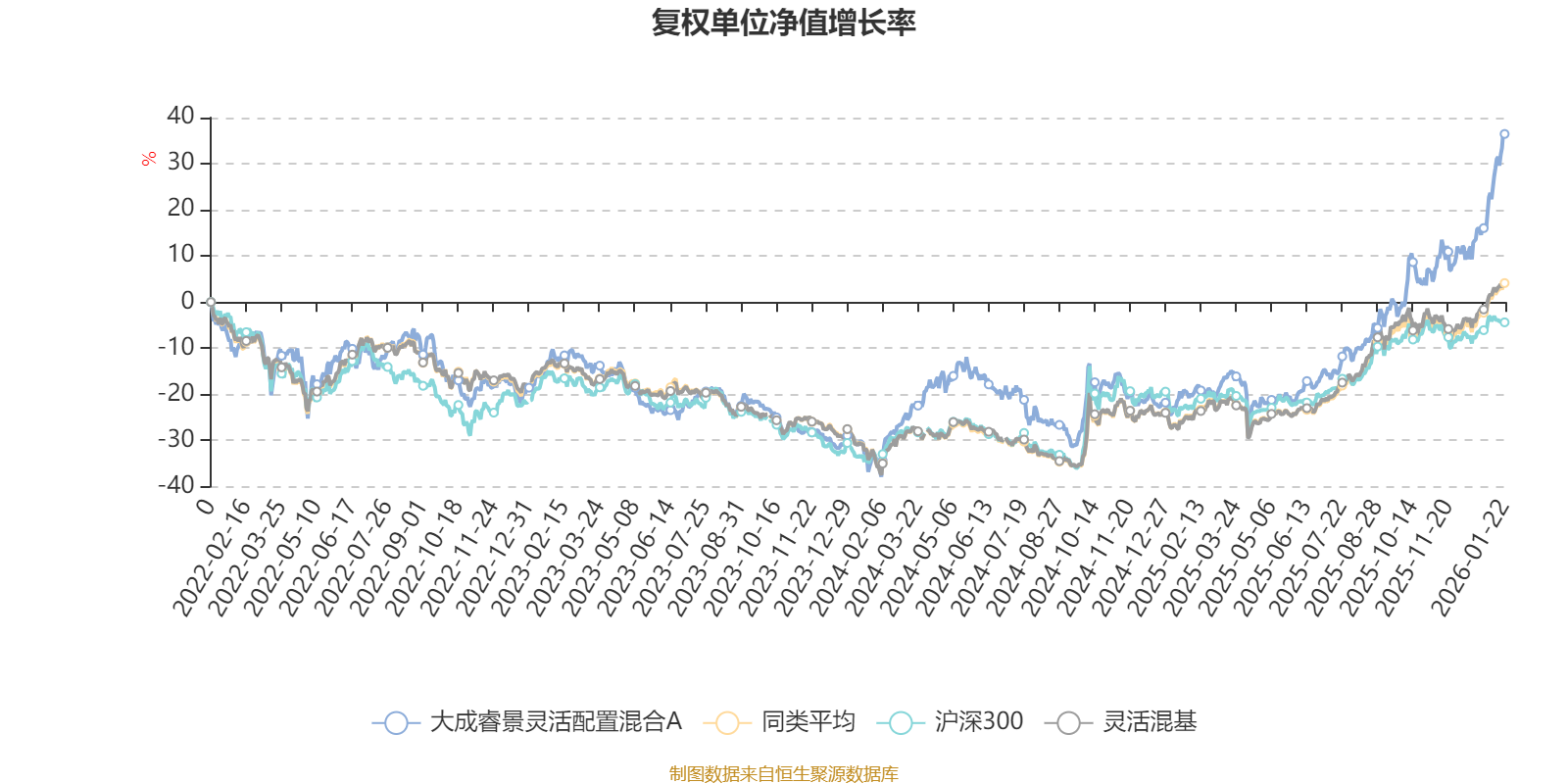 截至1月22日,大成睿景灵活配置混合A近三个月复权单位净值增长率为31.07%,位于同类可比基金32/1286;近半年复权单位净值增长率为54.67%,位于同类可比基金123/1286;近一年复权单位净值增长率为70.70%,位于同类可比基金125/1286;近三年复权单位净值增长率为56.68%,位于同类可比基金143/1286。