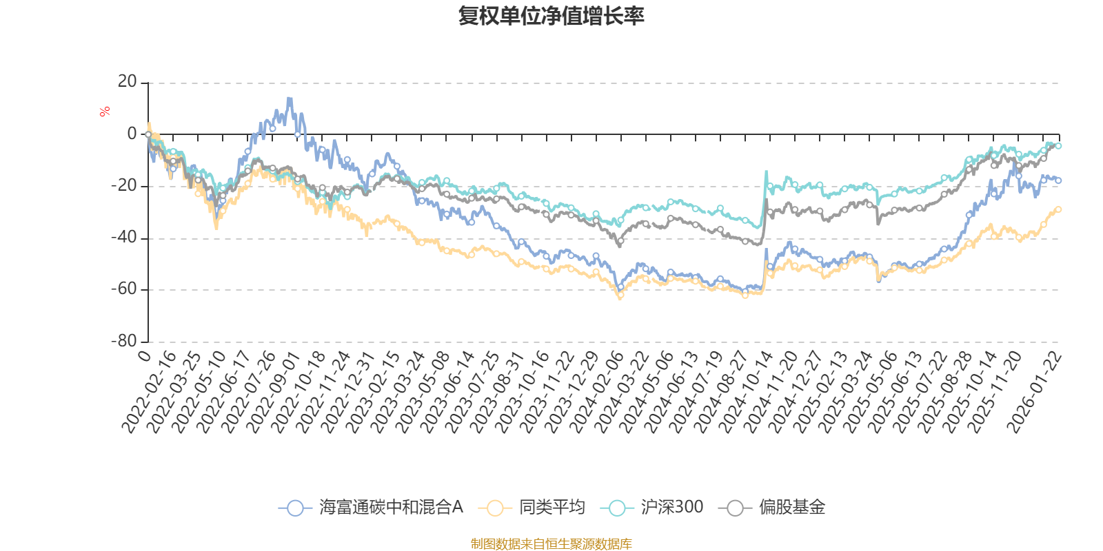 截至1月22日,海富通碳中和混合A近三个月复权单位净值增长率为9.04%,位于同类可比基金70/100;近半年复权单位净值增长率为47.31%,位于同类可比基金15/100;近一年复权单位净值增长率为61.93%,位于同类可比基金18/92;近三年复权单位净值增长率为-7.69%,位于同类可比基金50/68。