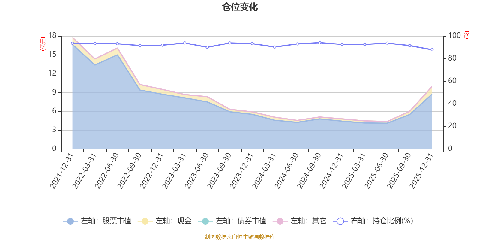 据定期报告数据统计,近三年平均股票仓位为92.19%,同类平均为87.15%。2024年三季度末基金达到94.09%的最高仓位,2025年末最低,为87.8%。
