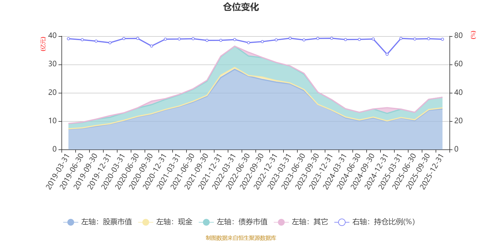 据定期报告数据统计,近三年平均股票仓位为77.14%,同类平均为67.52%。2023年末基金达到78.51%的最高仓位,2024年末最低,为67.22%。
