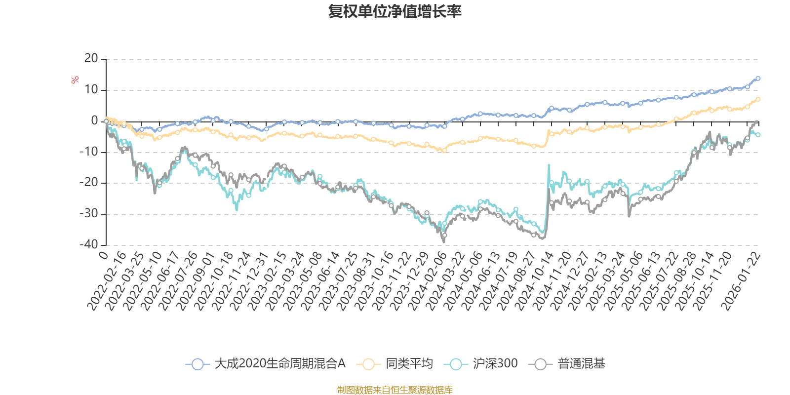 截至1月22日,大成2020生命周期混合A近三个月复权单位净值增长率为4.15%,位于同类可比基金110/629;近半年复权单位净值增长率为5.61%,位于同类可比基金228/629;近一年复权单位净值增长率为7.61%,位于同类可比基金325/626;近三年复权单位净值增长率为14.80%,位于同类可比基金187/564。