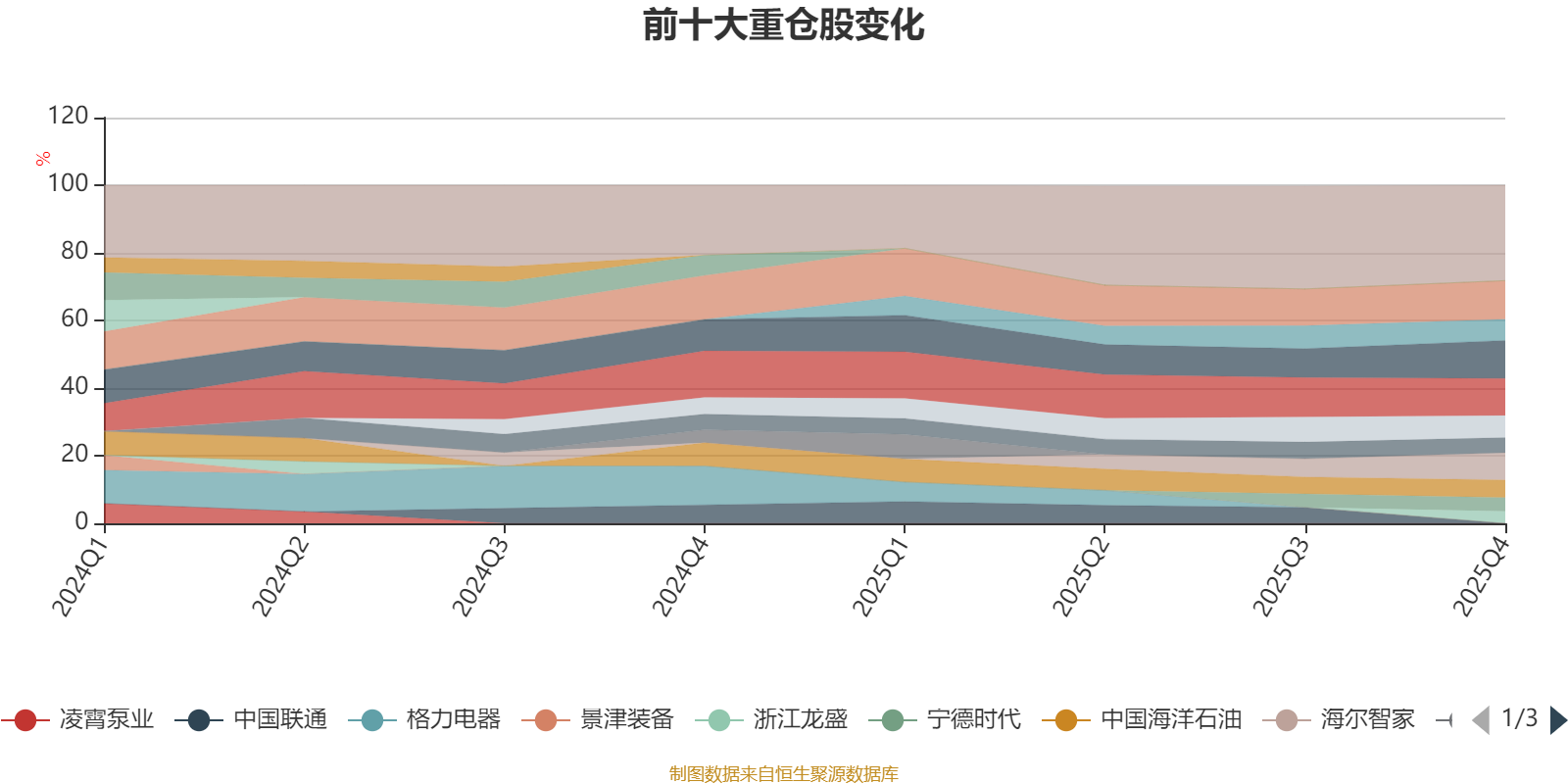 该基金持股集中度较高,近2年前十大重仓股集中度长期超过60%。截至2025年四季度末,基金十大重仓股分别是美的集团、豪迈科技、中国移动、海尔智家、福耀玻璃、腾讯控股、中国海洋石油、华域汽车、宁德时代、浙江龙盛。