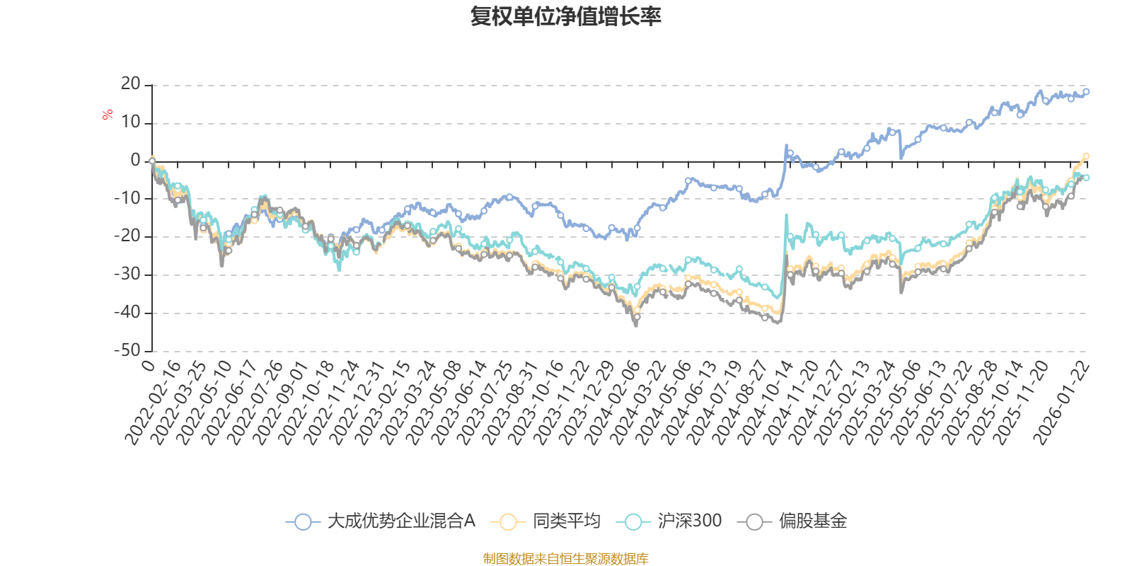 截至1月22日,大成优势企业混合A近三个月复权单位净值增长率为4.99%,位于同类可比基金88/130;近半年复权单位净值增长率为7.33%,位于同类可比基金110/130;近一年复权单位净值增长率为16.80%,位于同类可比基金114/130;近三年复权单位净值增长率为38.15%,位于同类可比基金28/125。