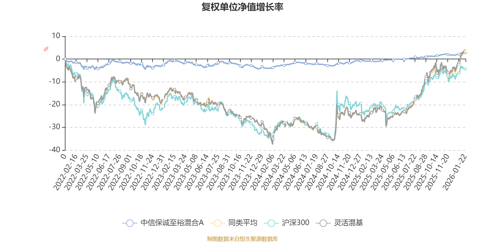 截至1月22日,中信保诚至裕混合A近三个月复权单位净值增长率为1.31%,位于同类可比基金1090/1286;近半年复权单位净值增长率为1.94%,位于同类可比基金1171/1286;近一年复权单位净值增长率为3.89%,位于同类可比基金1228/1286;近三年复权单位净值增长率为3.62%,位于同类可比基金951/1286。