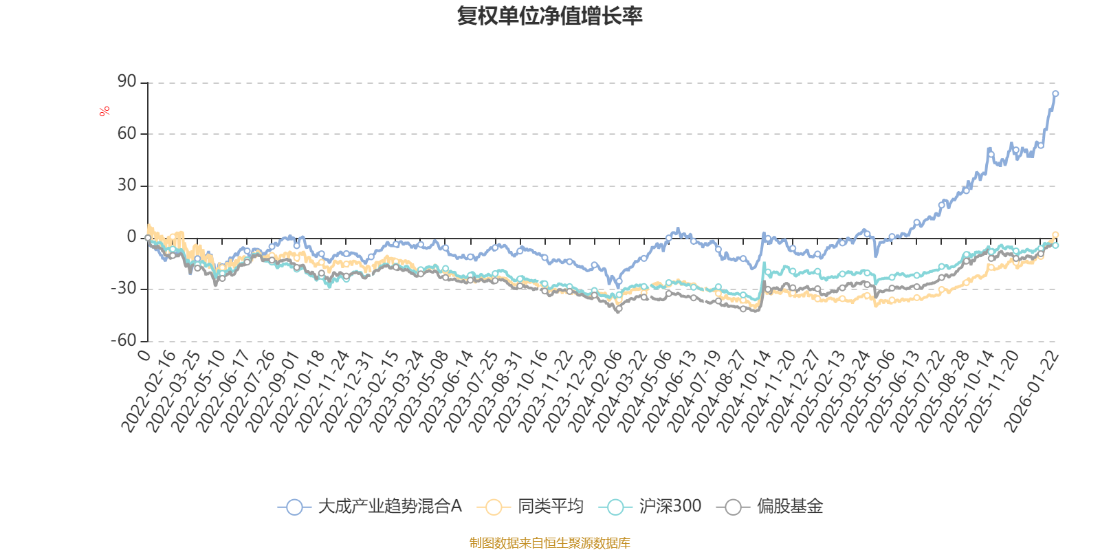 截至1月22日,大成产业趋势混合A近三个月复权单位净值增长率为28.70%,位于同类可比基金18/49;近半年复权单位净值增长率为54.27%,位于同类可比基金18/49;近一年复权单位净值增长率为92.70%,位于同类可比基金10/46;近三年复权单位净值增长率为92.06%,位于同类可比基金2/30。