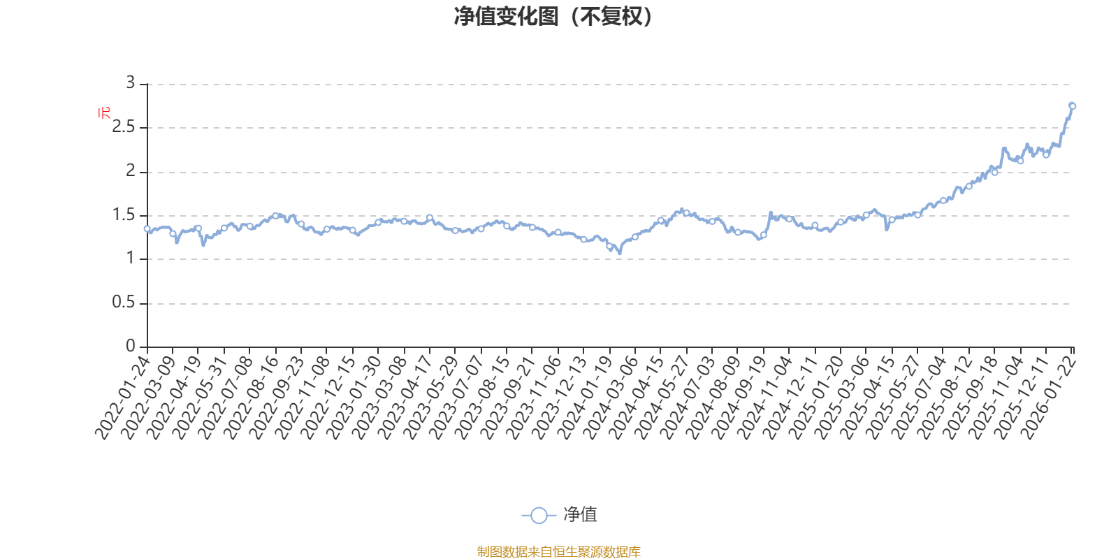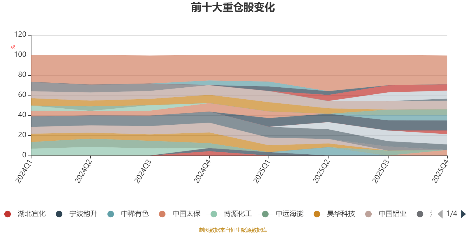 该基金持股集中度较高,近2年前十大重仓股集中度长期超过60%。截至2025年四季度末,基金重仓股分别是兴业银锡、山东黄金、招金矿业、锡业股份、HTSC、中国太保、中金黄金、中曼石油、赛轮轮胎、中国东方航空股份、中国东航。