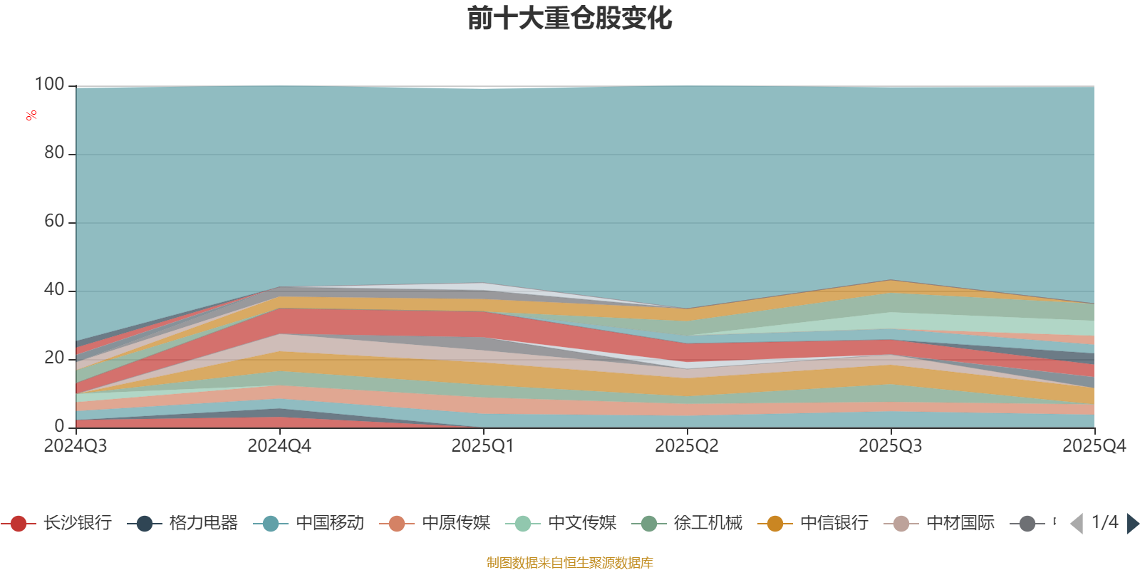 截至2025年四季度末,基金十大重仓股分别是美的集团、中信银行、太阳纸业、中国移动、建设银行、华泰证券、中联重科、中原传媒、海尔智家、中国人民保险集团。