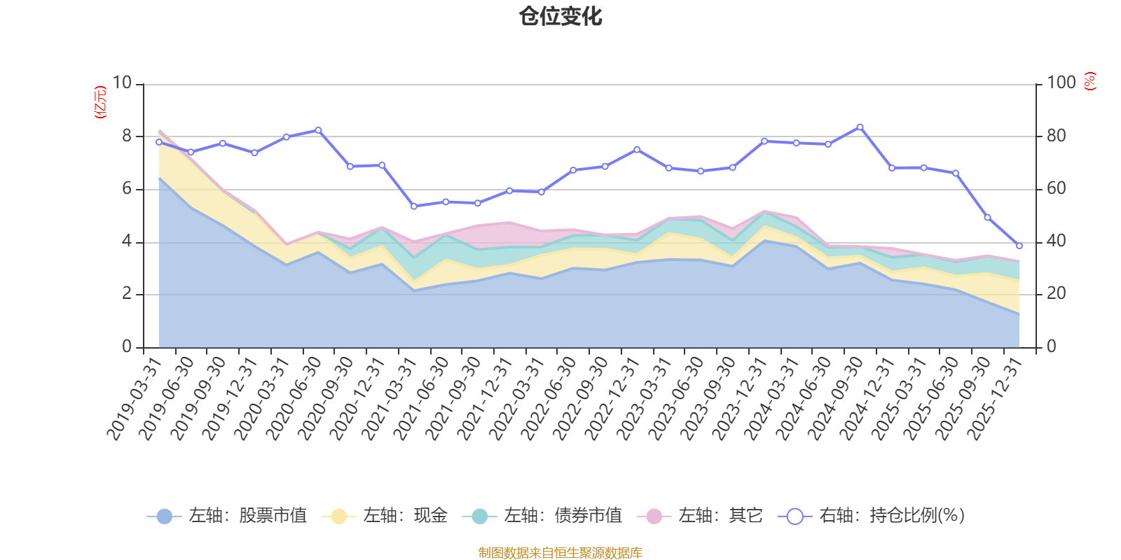 据定期报告数据统计,近三年平均股票仓位为67.56%,同类平均为72.57%。2024年三季度末基金达到83.66%的最高仓位,2025年末最低,为38.6%。
