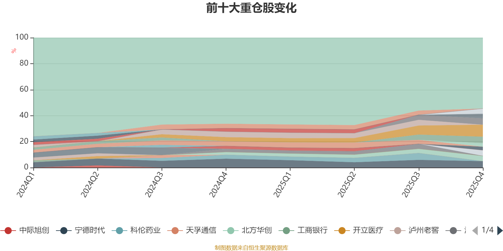 截至2025年四季度末,基金十大重仓股分别是寒武纪、新易盛、宁德时代、中芯国际、阿特斯、海光信息、北方华创、中信证券、紫金矿业、佰维存储。