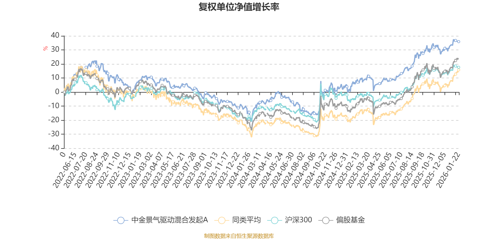 截至1月22日,中金景气驱动混合发起A近三个月复权单位净值增长率为4.26%,位于同类可比基金492/621;近半年复权单位净值增长率为16.48%,位于同类可比基金450/621;近一年复权单位净值增长率为27.70%,位于同类可比基金452/613;近三年复权单位净值增长率为25.05%,位于同类可比基金203/535。