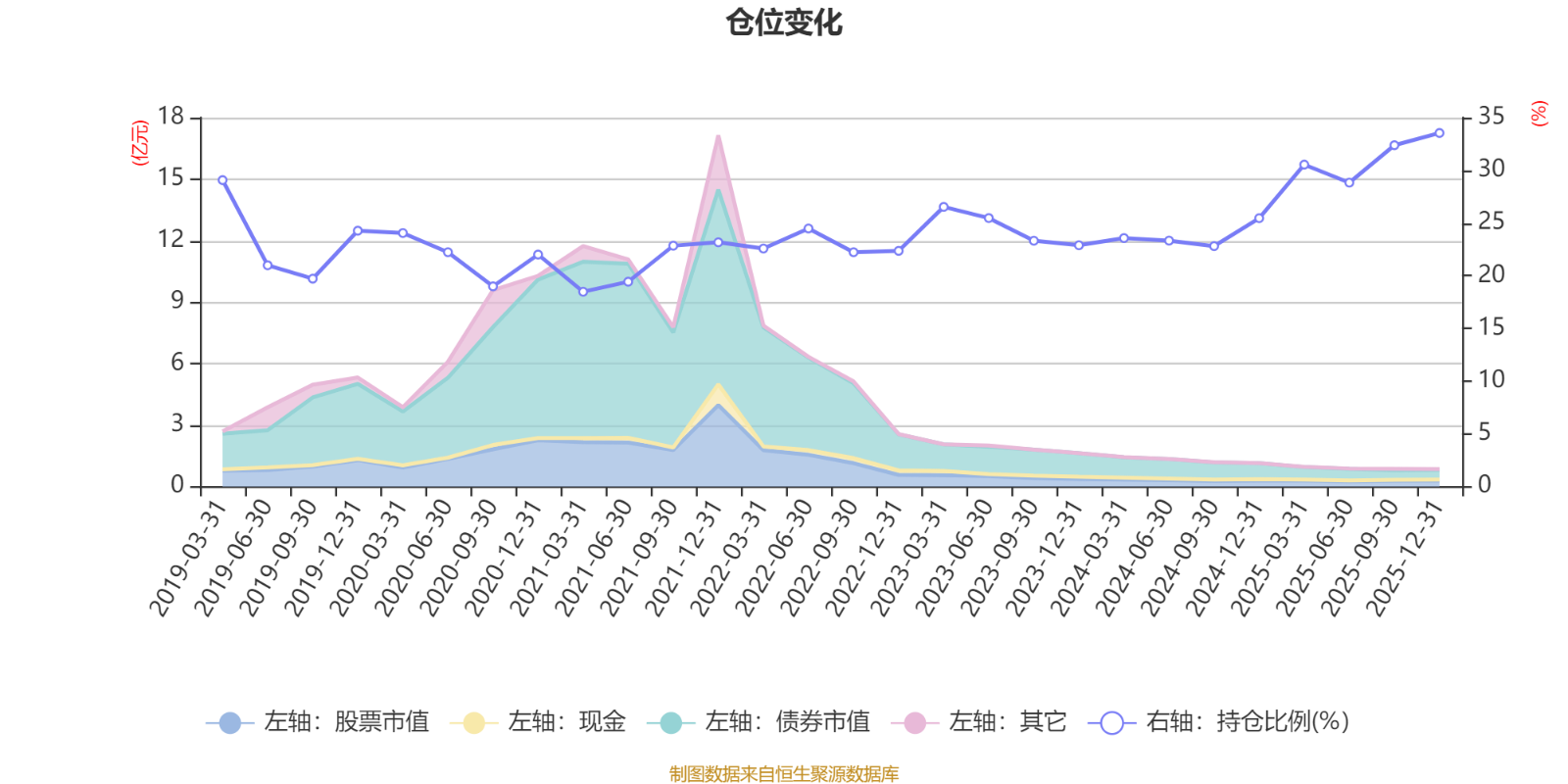 据定期报告数据统计,近三年平均股票仓位为26.56%,同类平均为72.57%。2025年末基金达到33.54%的最高仓位,2021年一季度末最低,为18.48%。