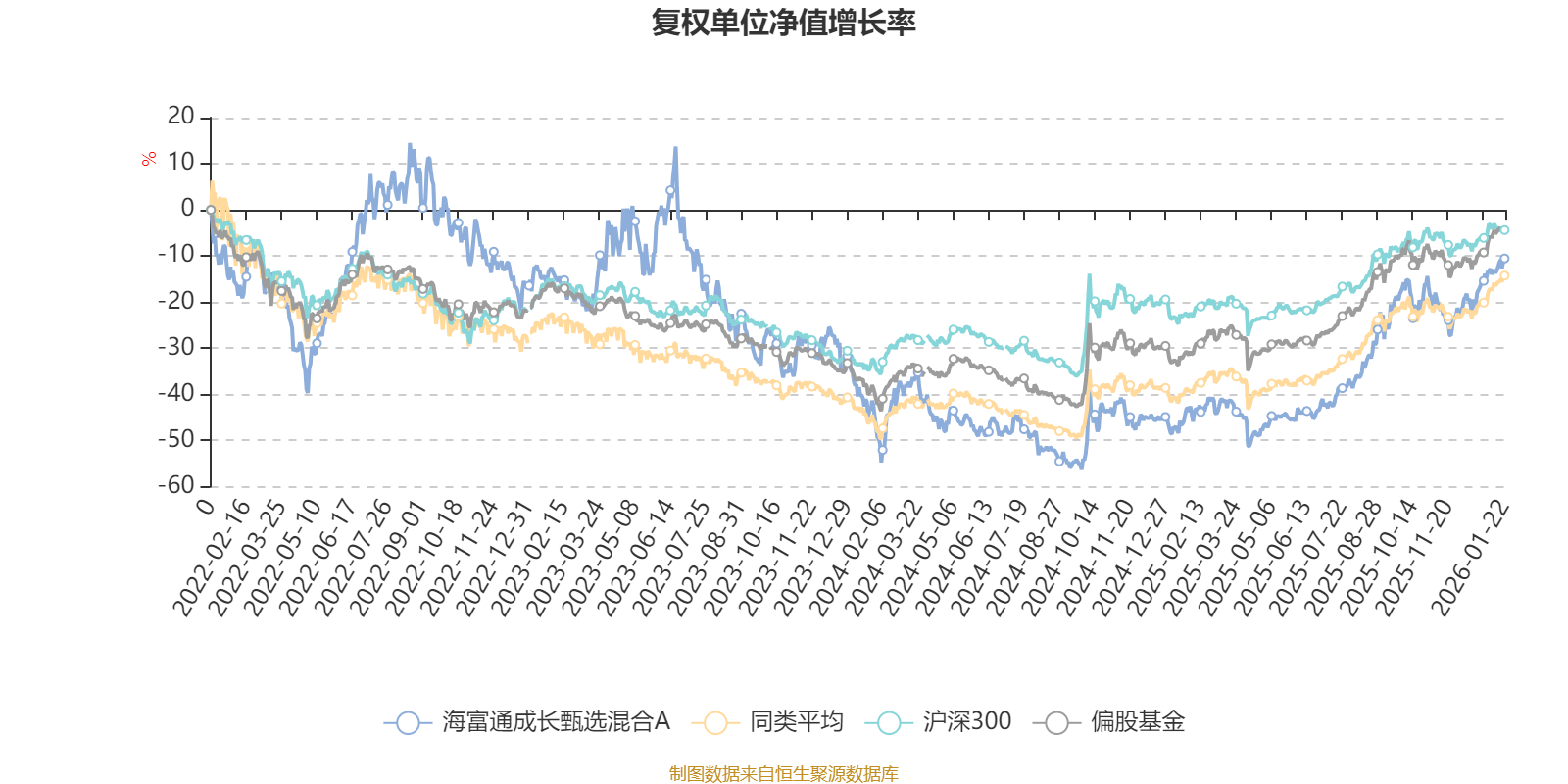 截至1月22日,海富通成长甄选混合A近三个月复权单位净值增长率为12.26%,位于同类可比基金199/621;近半年复权单位净值增长率为45.83%,位于同类可比基金69/621;近一年复权单位净值增长率为56.77%,位于同类可比基金142/613;近三年复权单位净值增长率为4.97%,位于同类可比基金360/535。