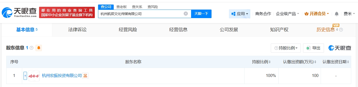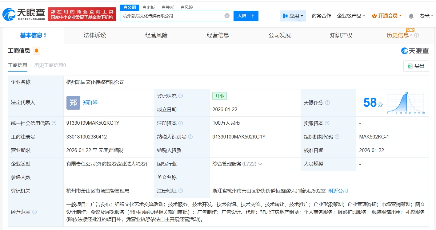 天眼查工商信息显示,近日,杭州凯辰文化传媒有限公司成立,法定代表人为郑群娣,董事为宗馥莉,注册资本100万人民币,经营范围包括广告发布、组织文化艺术交流活动、企业形象策划等。股东信息显示,该公司由杭州宏振投资有限公司全资持股,后者由宗馥莉全资持股。