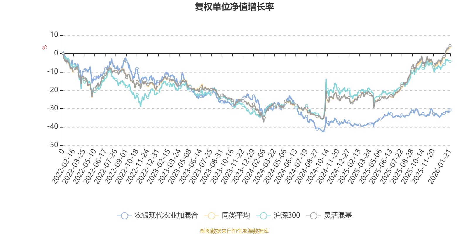 截至1月21日,农银现代农业加混合近三个月复权单位净值增长率为4.25%,位于同类可比基金876/1286;近半年复权单位净值增长率为4.73%,位于同类可比基金1078/1286;近一年复权单位净值增长率为12.34%,位于同类可比基金1049/1286;近三年复权单位净值增长率为-20.27%,位于同类可比基金1226/1286。