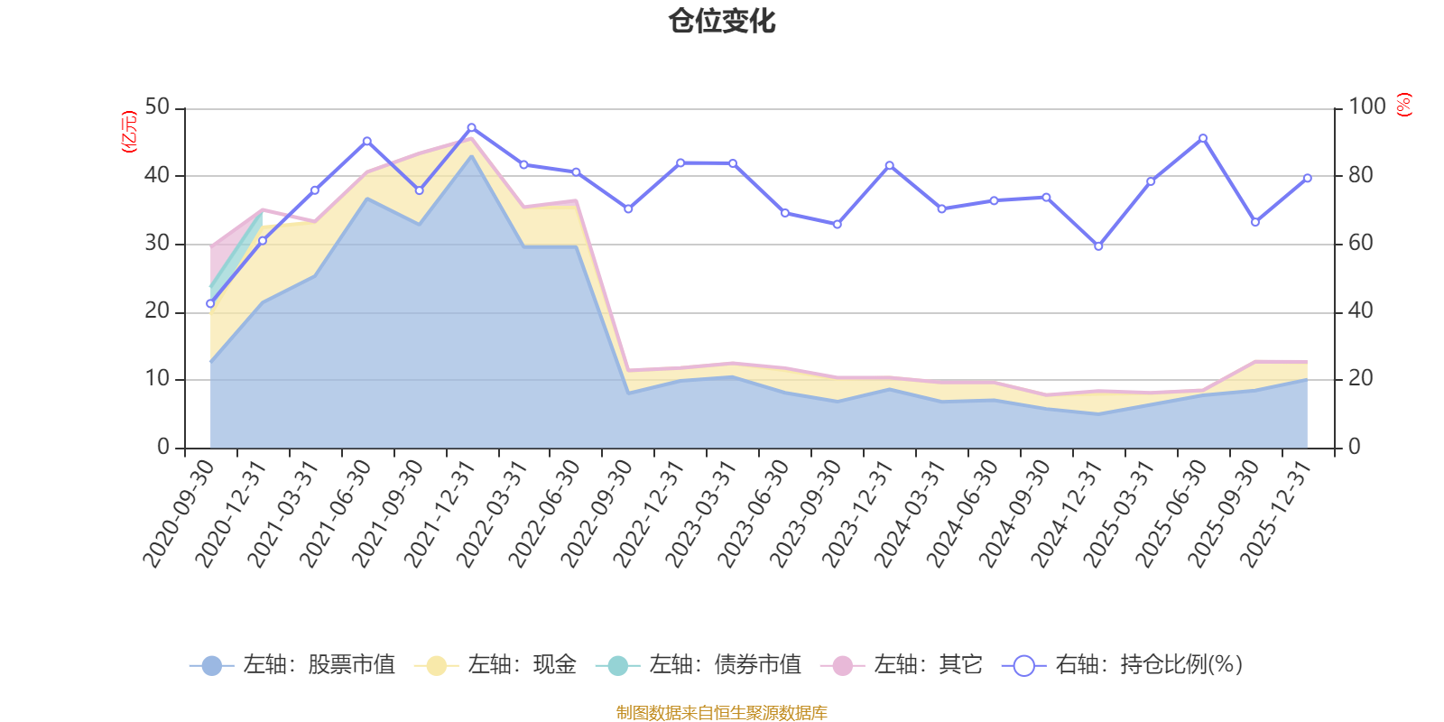 据定期报告数据统计,近三年平均股票仓位为74.51%,同类平均为86.12%。2021年末基金达到94.35%的最高仓位,2020年三季度末最低,为42.53%。