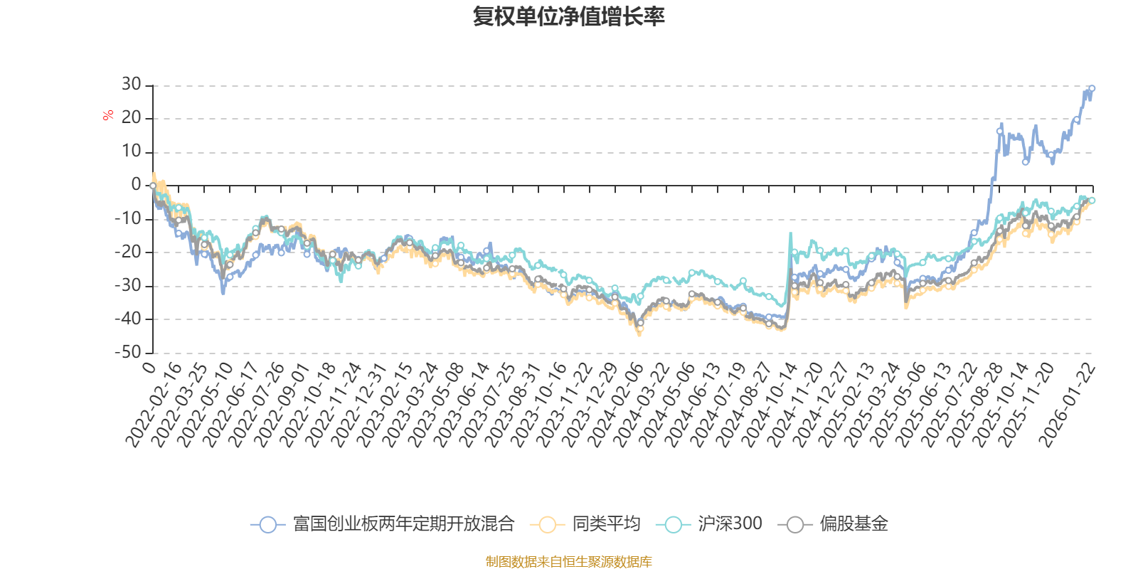 截至1月22日,富国创业板两年定期开放混合近三个月复权单位净值增长率为15.96%,位于同类可比基金42/265;近半年复权单位净值增长率为50.16%,位于同类可比基金24/265;近一年复权单位净值增长率为75.76%,位于同类可比基金16/265;近三年复权单位净值增长率为53.96%,位于同类可比基金21/256。