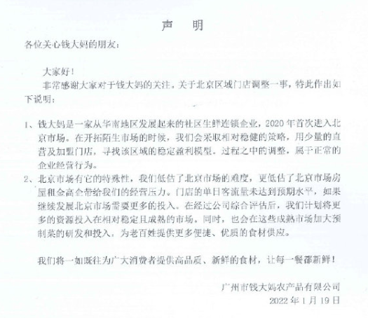 对此,钱大妈曾表示,北京市场有它的特殊性,公司低估了北京市场的难度,更低估了北京市场房屋租金高企带来的经营压力。门店的单日客流量未达到预期水平,如果继续发展北京市场需要更多的投入。在经过公司综合评估后,计划将更多的资源投入在相对稳定且成熟的市场。同时,也会在这些成熟市场加大预制菜的研发和投入,为老百姓提供更多便捷、优质的食材供应。