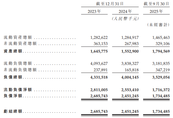 招股书显示,截至2025年三季度末,钱大妈资产总额为17.95亿元,负债总额35.29亿元,资产负债率高达196.65%,流动负债净额达17.16亿元。