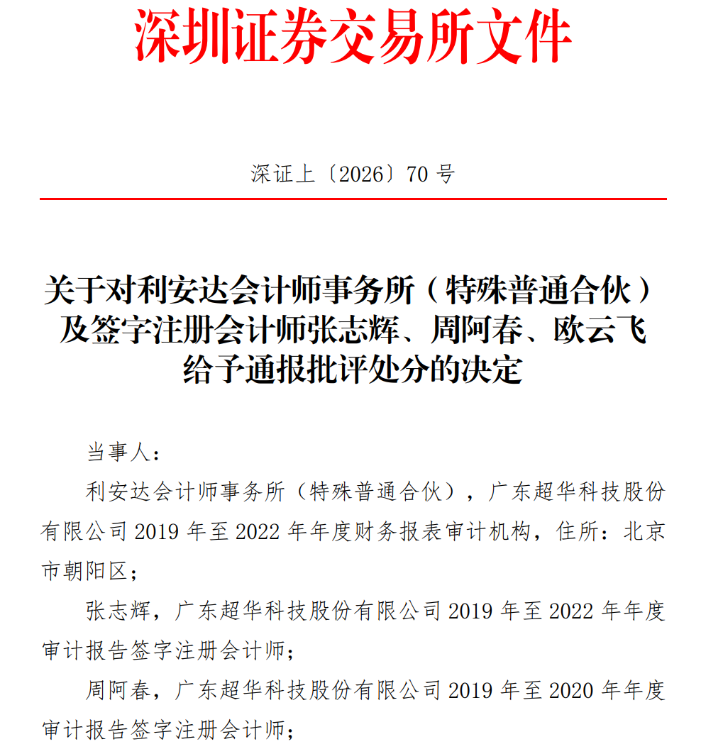 1月22日,深交所公布《关于对利安达会计师事务所(特殊普通合伙)及签字注册会计师张志辉、周阿春、欧云飞给予通报批评处分的决定》。
