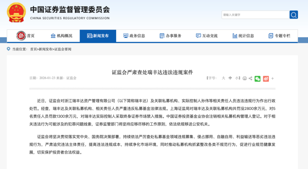 据证监会1月23日消息,近日,证监会对浙江瑞丰达资产管理有限公司(以下简称瑞丰达)及关联私募机构、实际控制人孙伟等相关责任人员违法违规行为作出行政处罚。经查,瑞丰达及关联私募机构、相关责任人员严重违反私募基金法律法规。