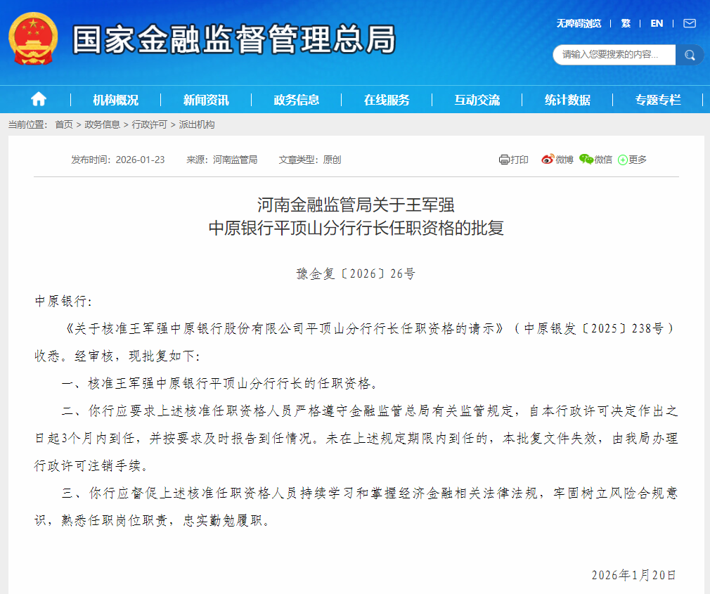 【大河财立方消息】1月23日消息,河南金融监管局批复,核准王军强中原银行平顶山分行行长的任职资格。