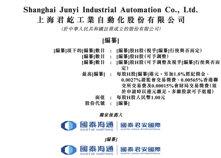 据港交所文件,1月23日,上海君屹工业自动化股份有限公司向港交所递交上市申请书,国泰海通为独家保荐人。