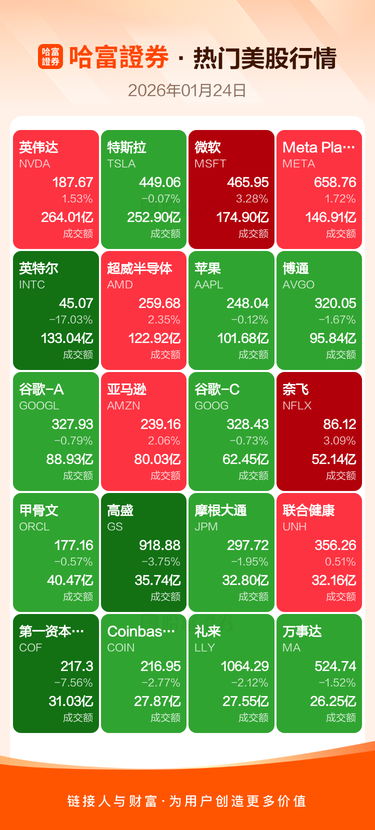 英伟达涨1.53%,特斯拉跌0.07%,微软涨3.28%,Meta Platforms Inc-A涨1.72%,英特尔跌17.03%,超威半导体涨2.35%,苹果跌0.12%,博通跌1.67%,谷歌-A跌0.79%,亚马逊涨2.06%。