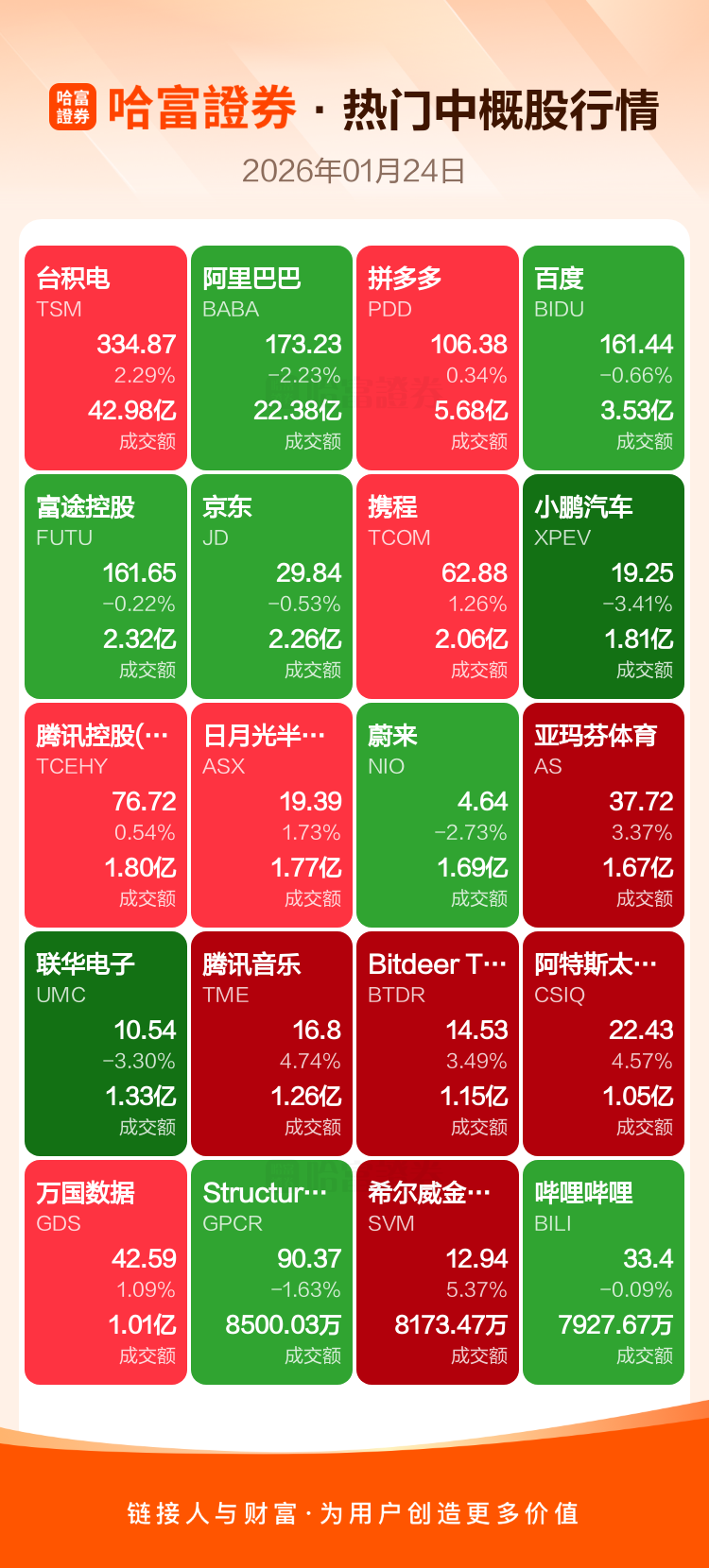 台积电涨2.29%,阿里巴巴跌2.23%,拼多多涨0.34%,百度跌0.66%,富途控股跌0.22%,京东跌0.53%,携程涨1.26%,小鹏汽车跌3.41%,腾讯控股(ADR)涨0.54%,日月光半导体涨1.73%。