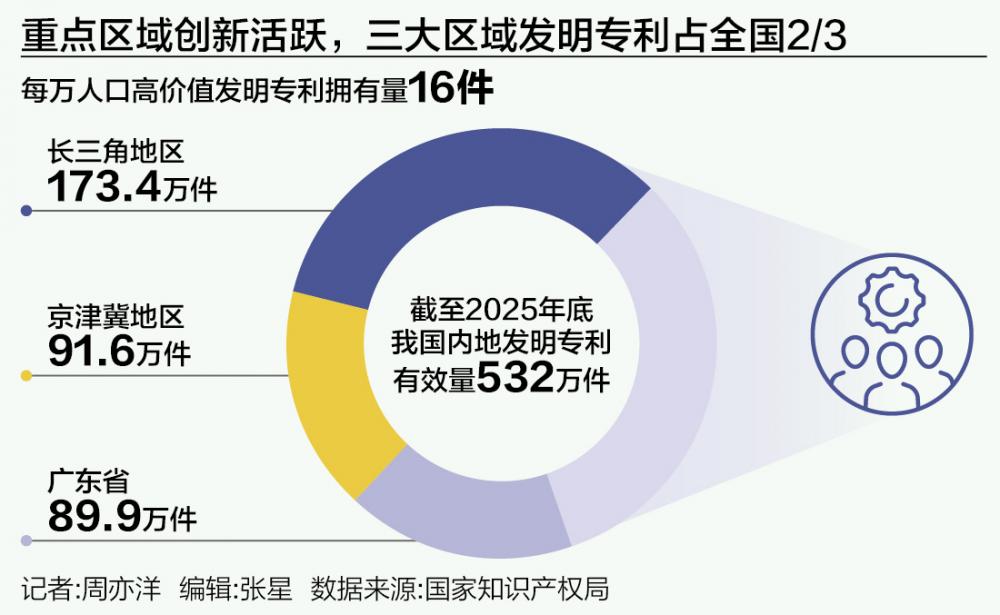 截至2025年底,我国内地发明专利有效量达到532万件,每万人口高价值发明专利拥有量达到16件,其中重点区域活力强劲,发明专利有效量合计约占国内总量的2/3。