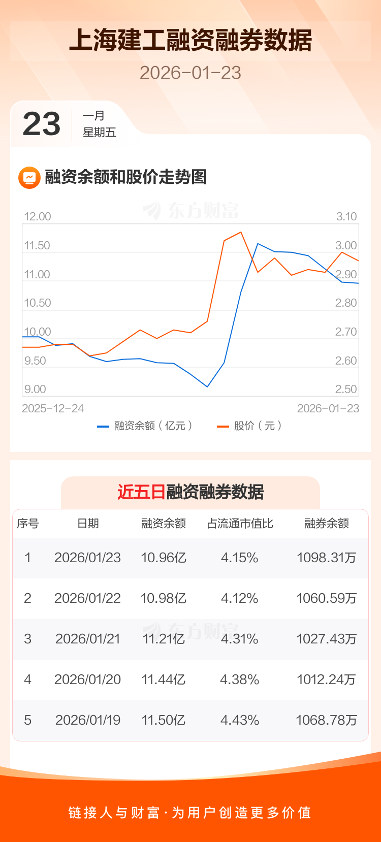 交易所最新数据显示,上海建工于2026年1月23日获融资买入8497.35万元,融资偿还8737.38万元,当日融资净偿还240.02万元。目前,该股融资余额10.96亿,占流通市值比例为4.15%。