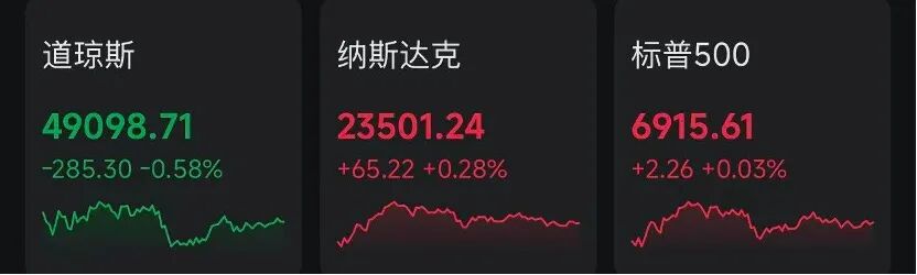 当地时间周五,美股三大指数涨跌不一。截至收盘,道指跌285.30点,跌幅0.58%,报49098.71点;纳指涨65.22点,涨幅0.28%,报23501.24点;标普500指数涨2.26点,涨幅0.03%,报6915.61点。