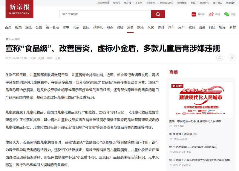 2025年12月,新京报刊发《宣称“食品级”、改善唇炎,虚标小金盾,多款儿童唇膏涉嫌违规》的调查报道,其中提及,记者在某购物平台以“儿童唇膏”为关键词进行搜索发现,戴可思旗舰店售卖的“戴可思婴儿护唇膏”在搜索结果界面宣称为“食品级润唇膏”,并标注“宝宝误舔无忧”;在商品详情界面以“权威检测机构鉴定通过”为宣传点,强调产品“经口无毒润唇不怕舔”。其贴出的检测报告图片写着:“结果汇总:根据《化妆品安全技术规范》(2015年版)对送检样品进行安全性检验,结果如下:(一)毒理学试验:急性经口毒性试验结果:实际无毒”。