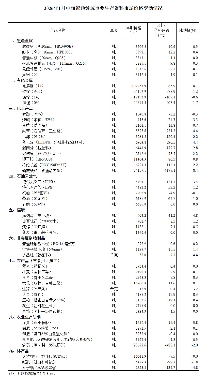 中新网1月24日电据国家统计局网站消息,国家统计局1月24日发布2026年1月中旬流通领域重要生产资料市场价格变动情况。据对全国流通领域9大类50种重要生产资料市场价格的监测显示,2026年1月中旬与1月上旬相比,29种产品价格上涨,13种下降,8种持平。