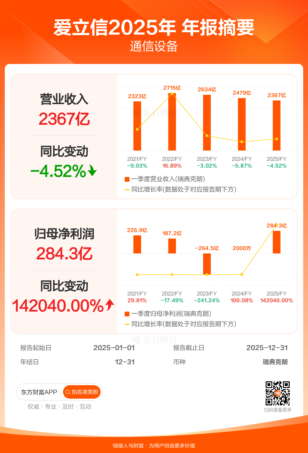 爱立信1月23日发布年报业绩,截至2025年12月31日的12个月内,该公司营业收入2366.81亿瑞典克朗,同比减少4.52%;公司权益持有人应占溢利(归母净利润)284.28亿瑞典克朗,同比增长142040.00%。