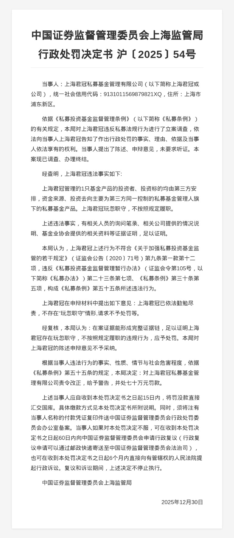 上海君冠私募被罚70万 责任人被罚21万 涉玩忽职守不履职