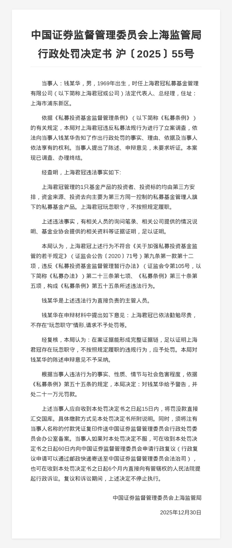 对此,中国证券监督管理委员会上海监管局决定对上海君冠私募基金管理有限公司责令改正,给予警告,并处70万元罚款;对钱某华给予警告,并处21万元罚款。