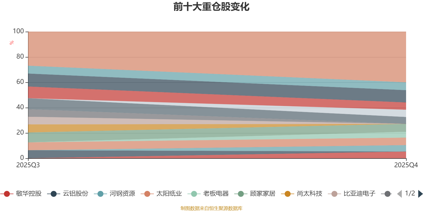 该基金持股集中度较高。截至2025年四季度末,基金十大重仓股分别是海吉亚医疗、顾家家居、神火股份、太阳纸业、明泰铝业、常熟汽饰、桐昆股份、敏华控股、河钢资源、老板电器。