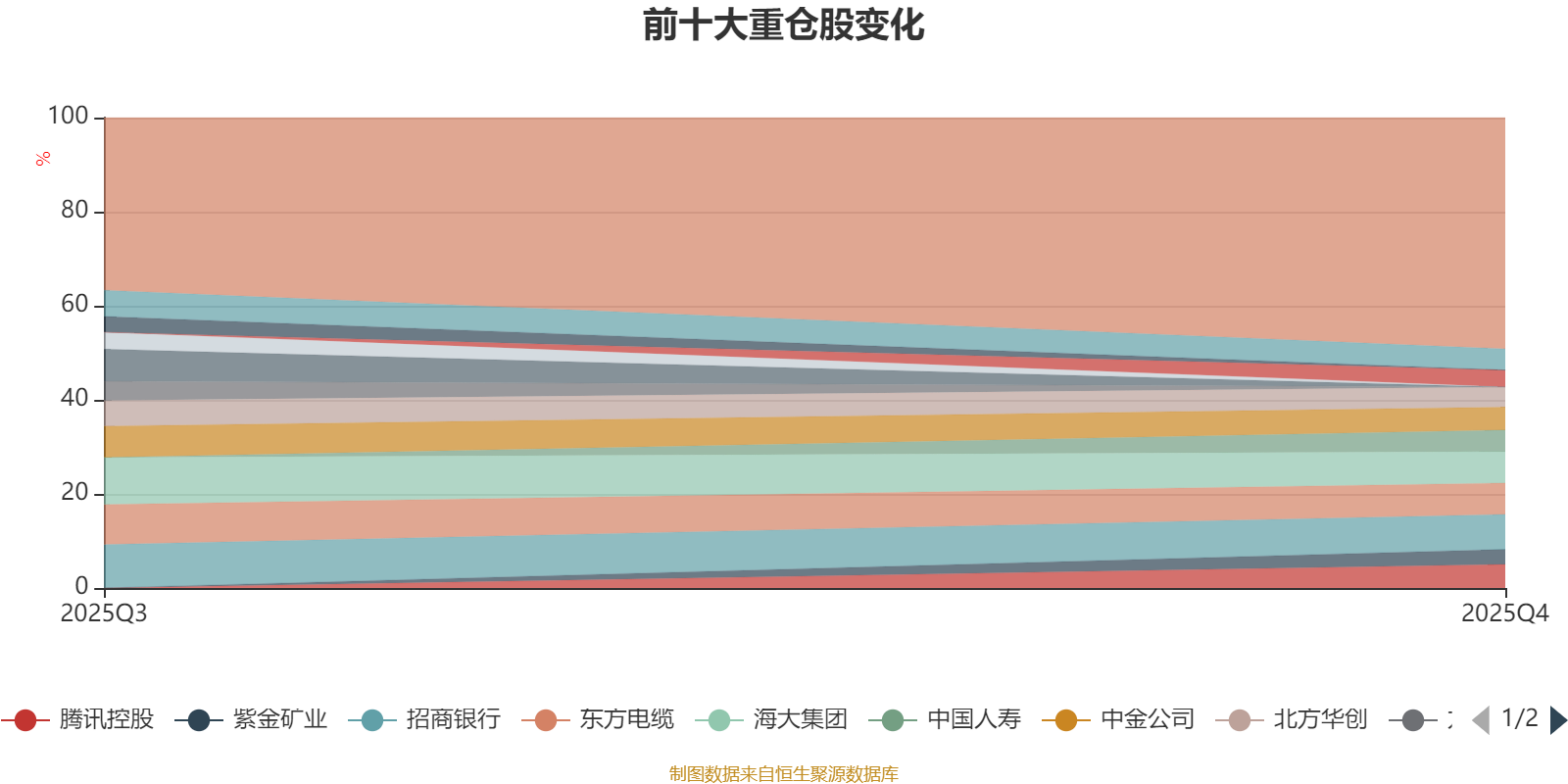 该基金持股集中度较高。截至2025年四季度末,基金十大重仓股分别是招商银行、海大集团、东方电缆、腾讯控股、中金公司、中国人寿、中国神华、北方华创、中钨高新、紫金矿业。