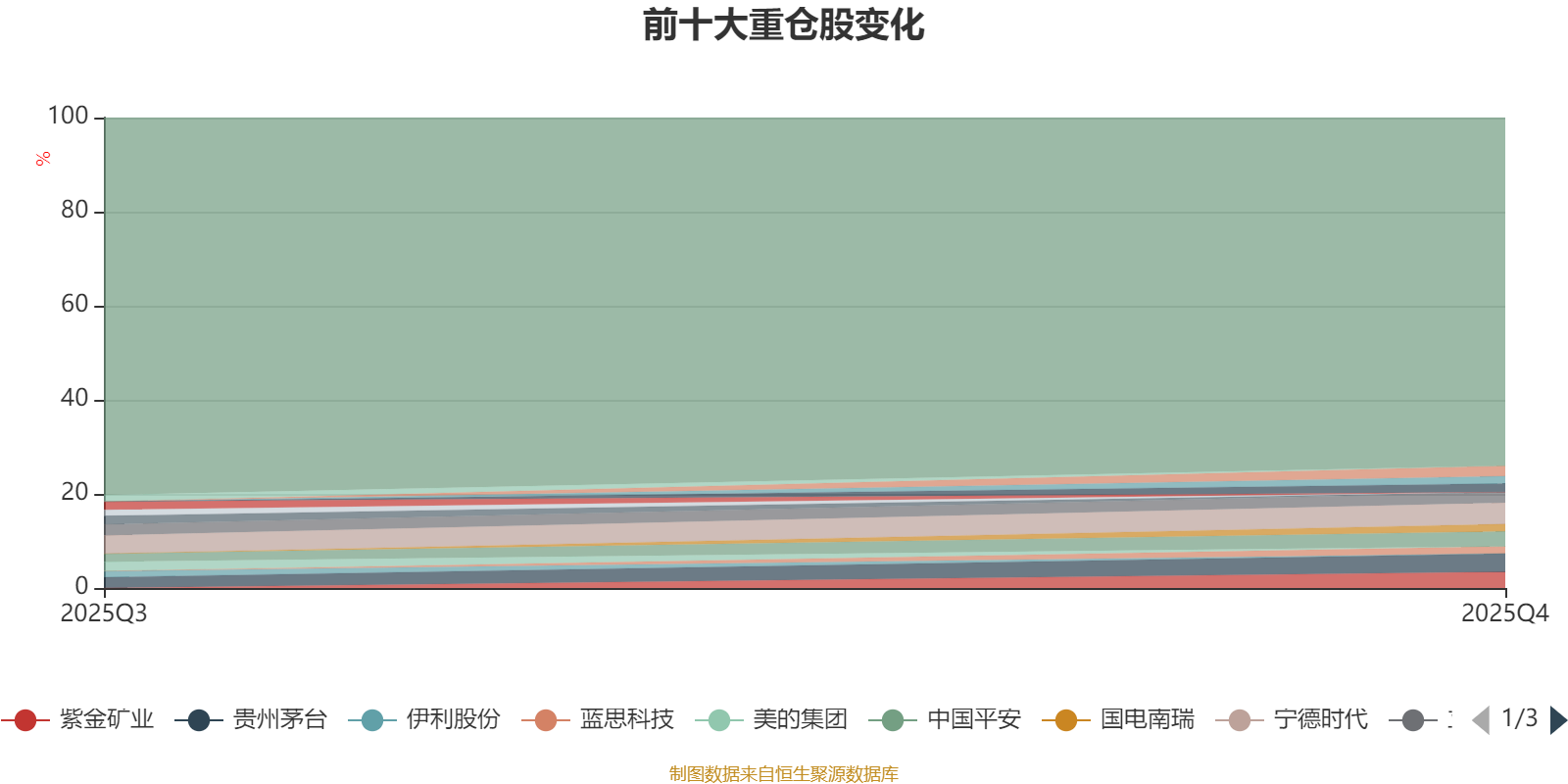 截至2025年四季度末,基金十大重仓股分别是宁德时代、贵州茅台、紫金矿业、中国平安、立讯精密、恒瑞医药、汇川技术、药明康德、国电南瑞、蓝思科技。