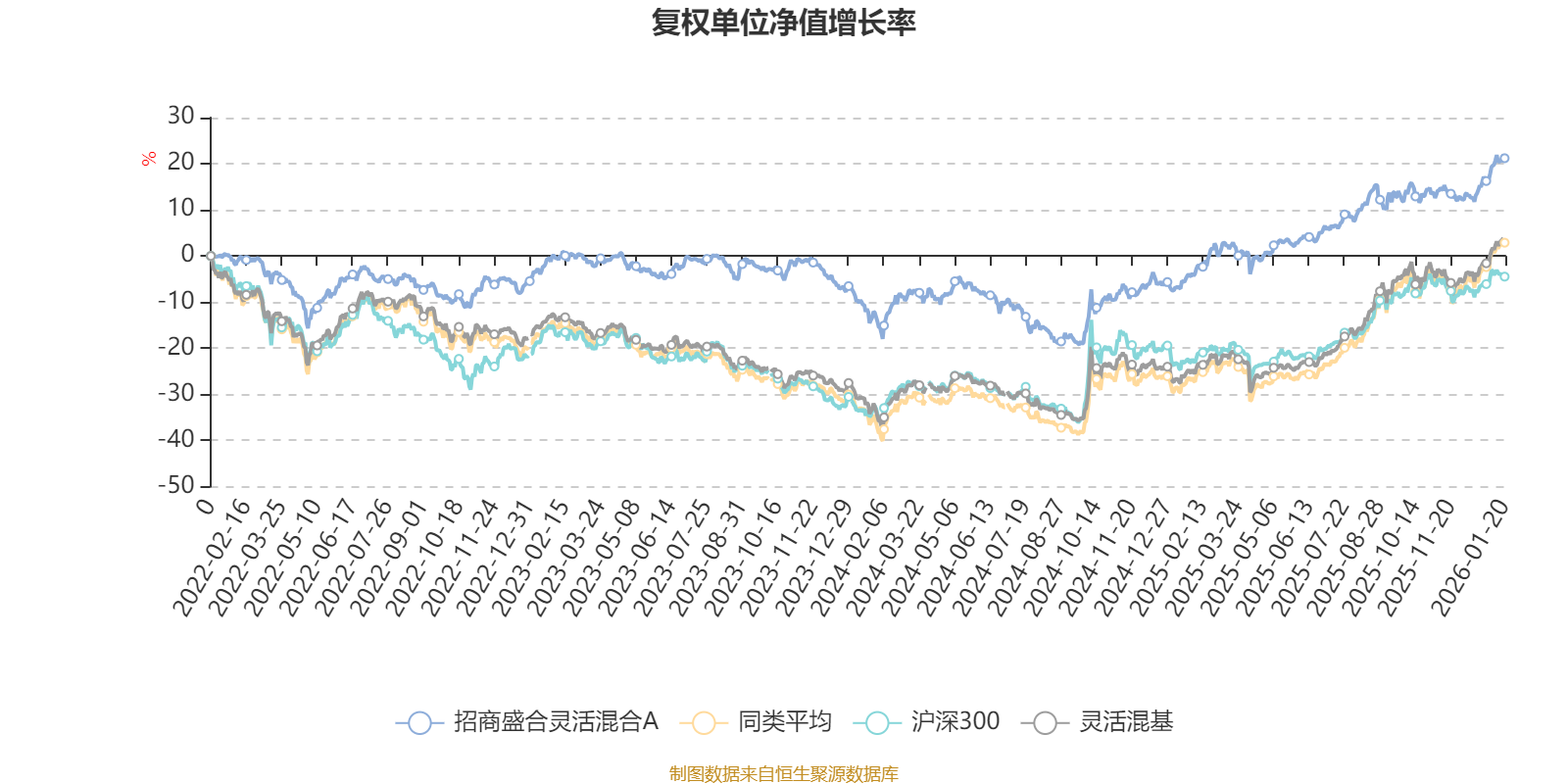 截至1月20日,招商盛合灵活混合A近三个月复权单位净值增长率为8.18%,位于同类可比基金581/960;近半年复权单位净值增长率为12.91%,位于同类可比基金757/960;近一年复权单位净值增长率为26.77%,位于同类可比基金632/957;近三年复权单位净值增长率为21.93%,位于同类可比基金403/955。