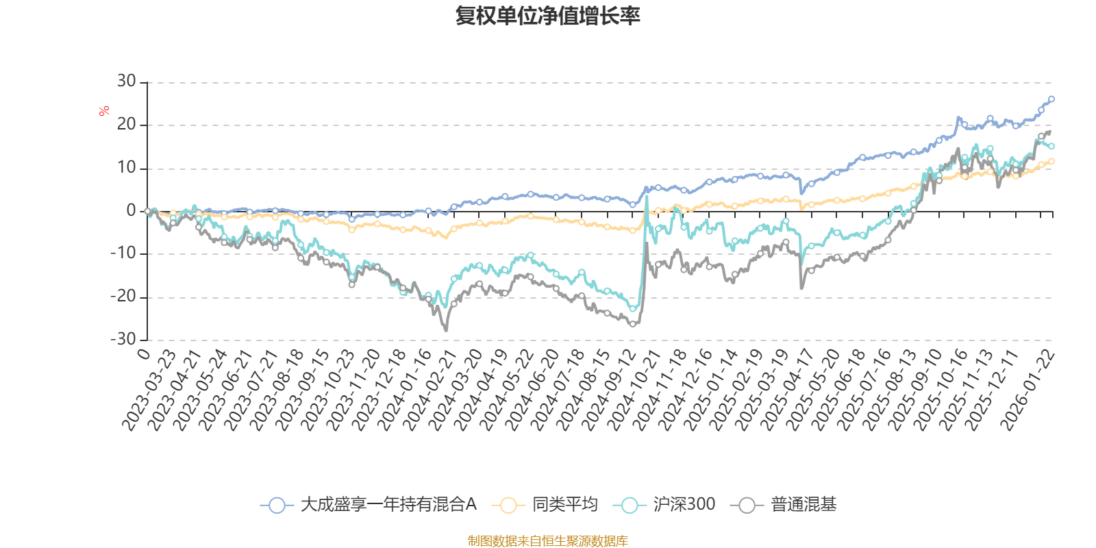 截至1月22日,大成盛享一年持有混合A近三个月复权单位净值增长率为5.85%,位于同类可比基金53/629;近半年复权单位净值增长率为10.96%,位于同类可比基金59/629;近一年复权单位净值增长率为17.04%,位于同类可比基金55/626。