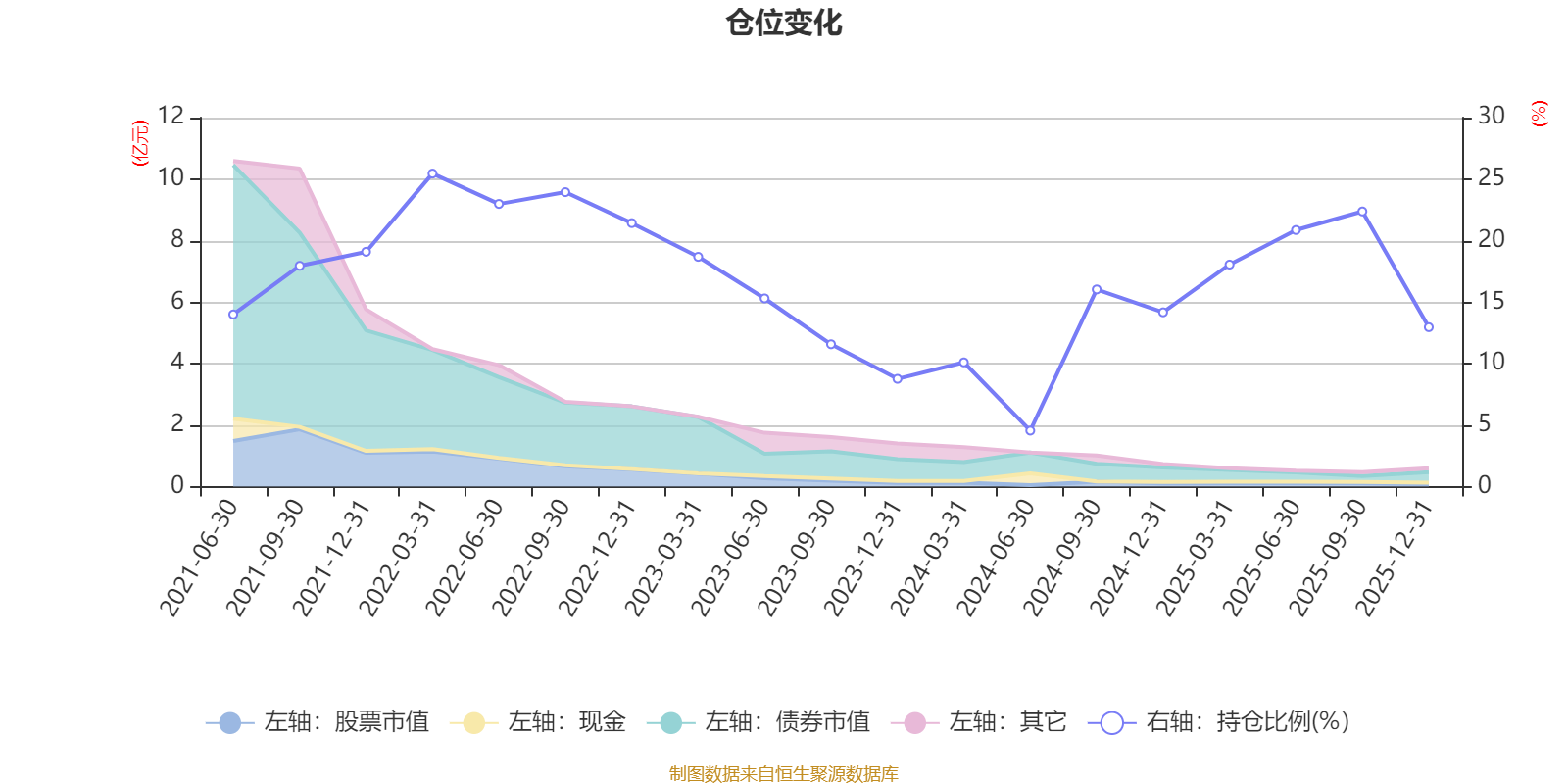 据定期报告数据统计,近三年平均股票仓位为14.45%,同类平均为19.2%。2022年一季度末基金达到25.45%的最高仓位,2024年上半年末最低,为4.55%。